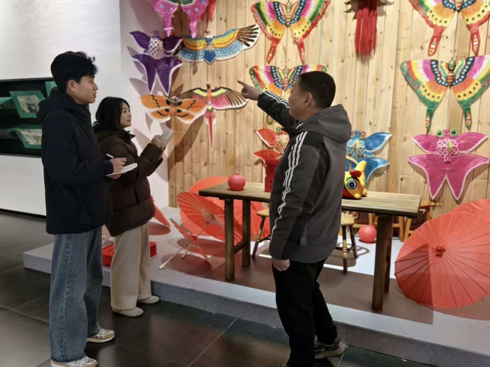 志愿者走进潍坊非物质文化展馆,深入探访各类非遗项目,在一件件精美展品与传统技艺展示中,真切感受潍坊非遗文化的深厚底蕴与独特魅力。在潍坊风筝博物馆,志愿者们近距离观摩风筝从选材、制作到绘画、成型的全流程传统工艺,深入了解风筝文化的历史渊源与传承脉络。在此基础上,实践团队进一步深入城市各个社区,耐心寻访藏在市井生活中的非遗故事与民间技艺,倾听非遗传承人的坚守与心声,并对当地多家商超展开调研,实地考察非遗文创产品及传统手工艺品的市场推广与销售情况,从日常消费中细致挖掘非遗与当代生活融合的生动印记。