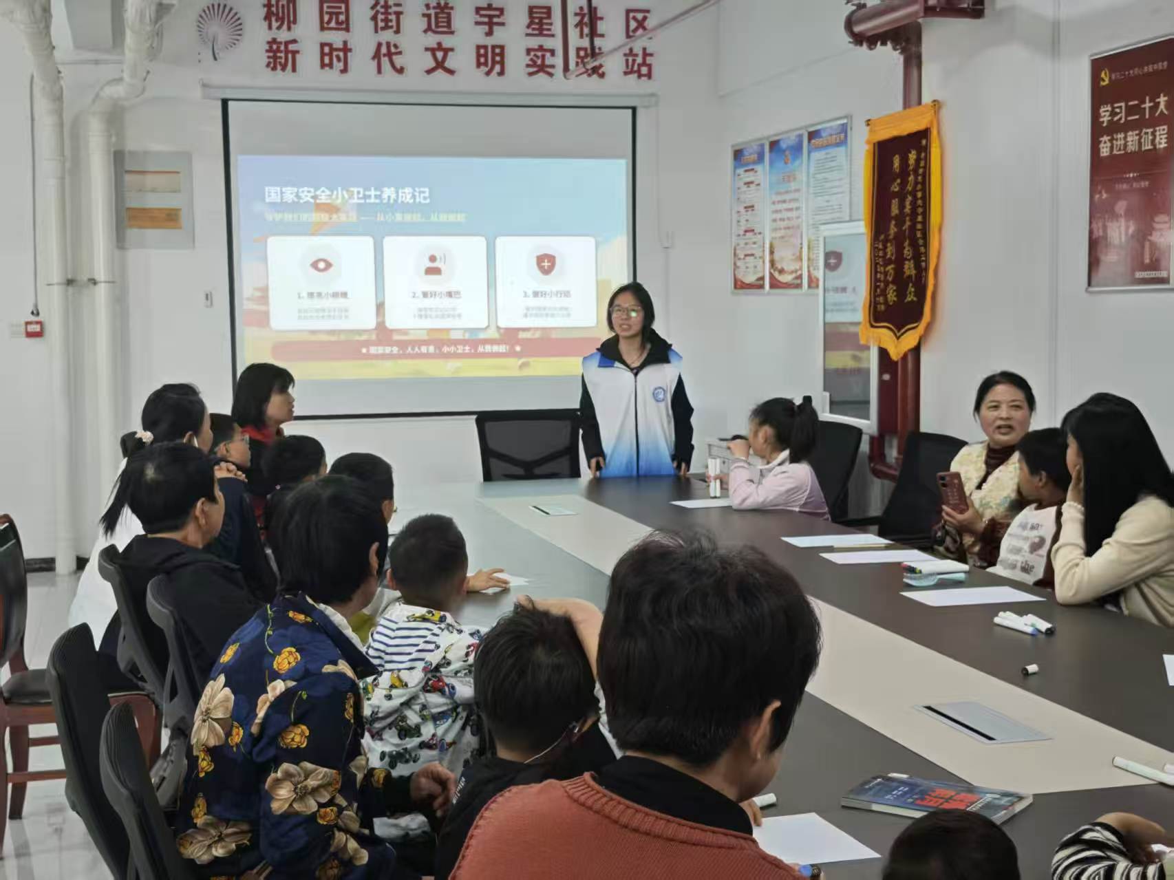 童心共筑安全防线,携手同护家国安宁。 4月11日,商学院(质量学院)社会实践部赴柳园街道宇星社区开展“童心筑防线,携手护国安”主题社会实践活动。活动现场,志愿者以通俗易懂的语言,结合演示文稿与安全教育宣传片,将国家安全相关知识转化为贴近生活的鲜活案例,系统讲解国家安全基本内涵、日常安全常识,以及网络安全、文化安全维护等重要内容。通过互动问答、情景模拟等形式,志愿者充分调动孩子们的参与积极性,推动国家安全观念入脑入心,并借助手抄报创作环节,引导小朋友以画笔为媒,将所学安全知识融入作品创作,充分展现少年儿童对国家安全初步认知的同时,充分体现了我院志愿活动的鲜明成效及幼年儿童安全意识与法治观念的持续提升。