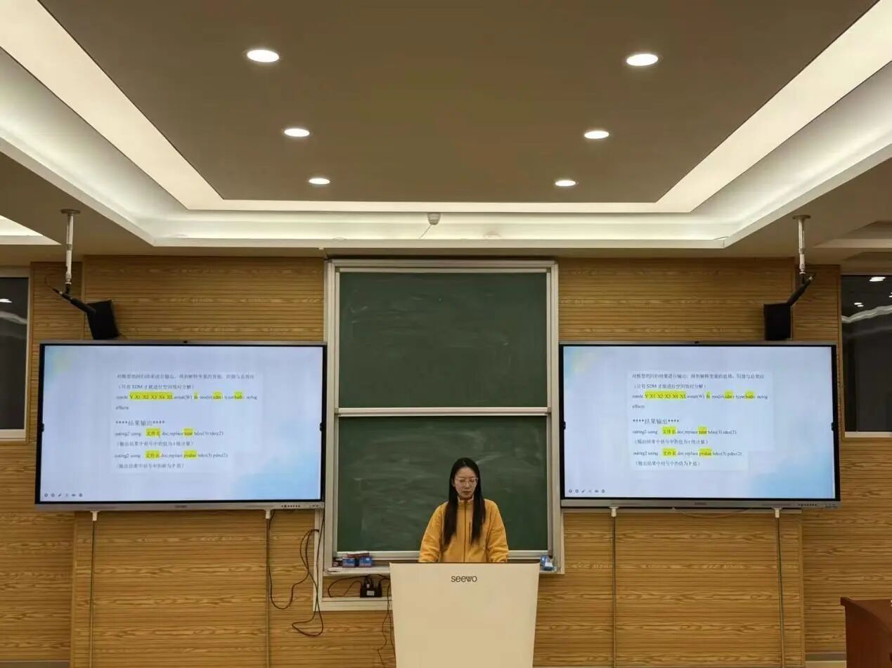 11月16日,由商学院(质量学院)研究生会主办、学术科研部承办的研究生学术沙龙第31期在学院708室举行,2024级应用经济学研究生马逍月、宋来俊、闫雨沙围绕“实证软件操作与论文写作”进行专题分享,学术科研部工作人员王香格担任主持人,学院2024级、2025级全体应用经济学研究生参会。