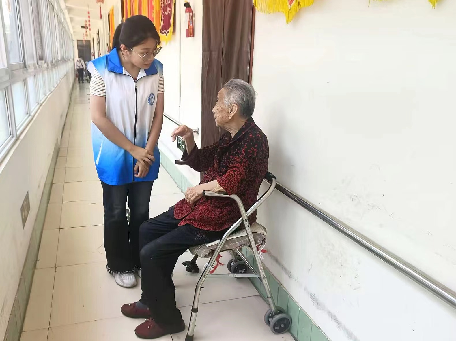 志愿者们分成若干个小组,积极帮助工作人员完成清扫的工作,为老人们营造一个干净整洁的生活环境,用实际行动表达对老人们的关爱。接着,志愿者与老人们进行面对面交流,了解他们的身体情况和饮食起居,耐心倾听他们讲述过去的故事,感受岁月的痕迹,帮助他们解决生活中的一些实际问题。活动过程中,志愿者们协助颐养中心工作人员,向老人们介绍了一些方便实用的生活小窍门和健康知识,提醒老人按时测量血压,定期体检,同时叮嘱他们要放松心情。通过与老人们的互动,志愿者们表示愿意继续为老年群体带去温暖和关怀发扬奉献精神。志愿者们的到来,让养老院变得热闹非凡,充满了欢声笑语。