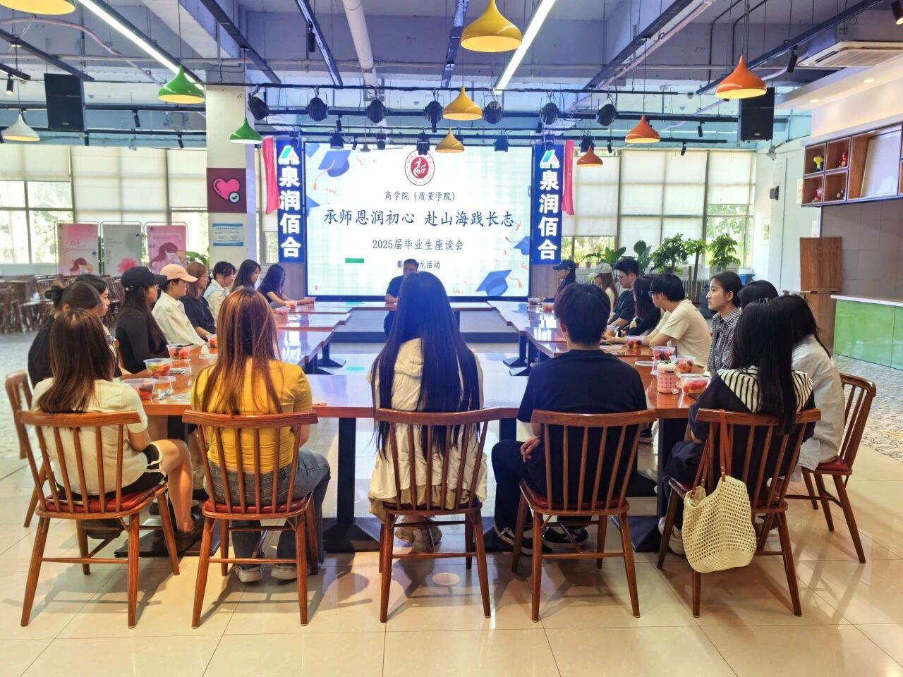 为进一步做好毕业生离校教育工作,加强师生情感联结,商学院(质量学院)在翰苑餐厅组织开展“承师恩润初心 赴山海践长志”2025届毕业生座谈会,学院辅导员高鹏与2025届毕业生代表齐聚一堂,共叙情谊、共话未来。