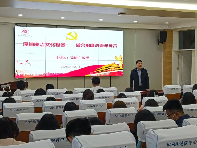 4月23日,商学院(质量学院)于东校区1#707举办入党积极分子专题党课培训会。学院党委纪检委员、副院长梁树广以《厚植廉洁文化根基 做合格廉洁青年党员》为题,对全体入党积极分子进行了培训。
