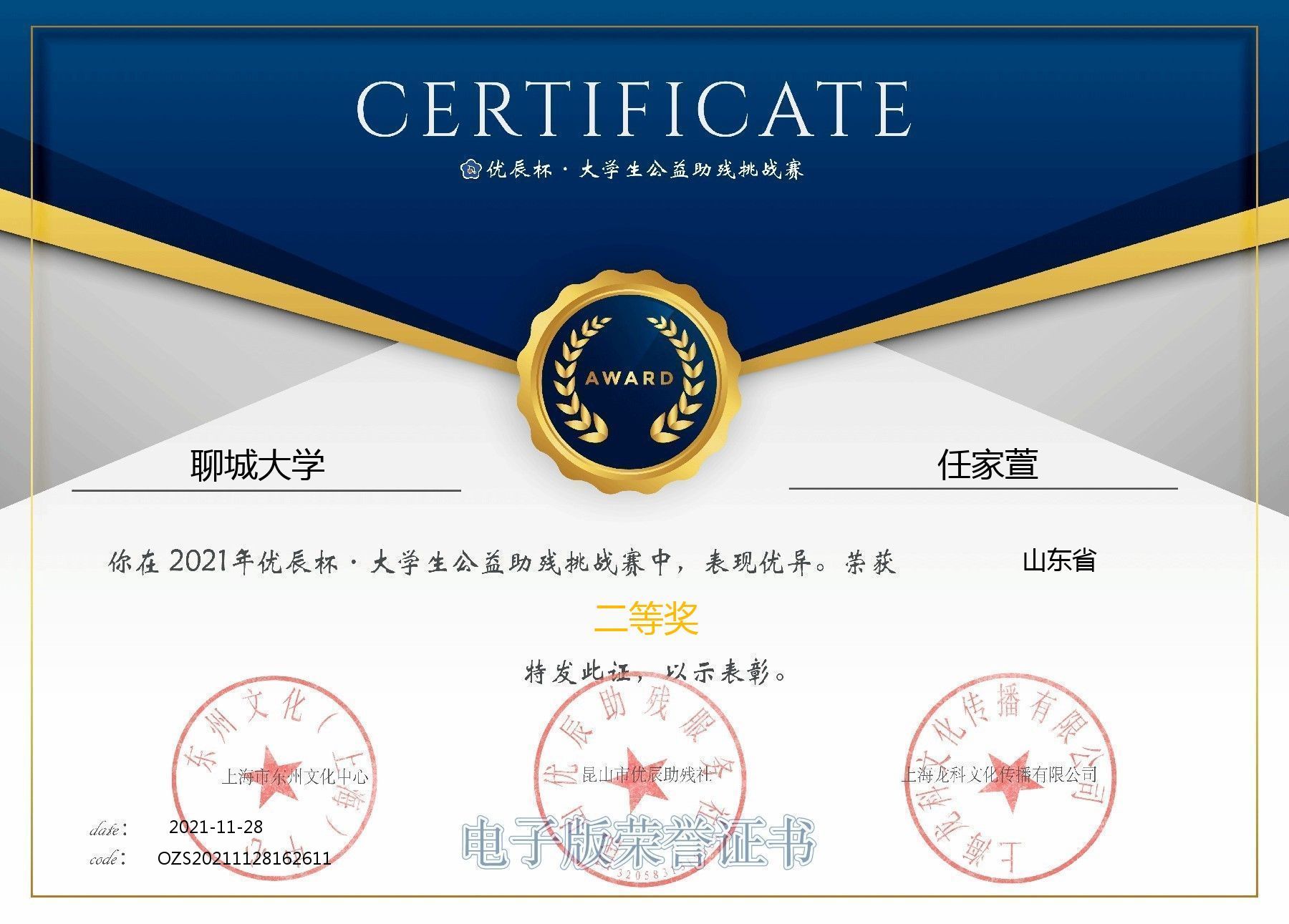 任家萱于2021年11月28日荣获2021年优辰杯大学生公益助残挑战赛山东省二等奖