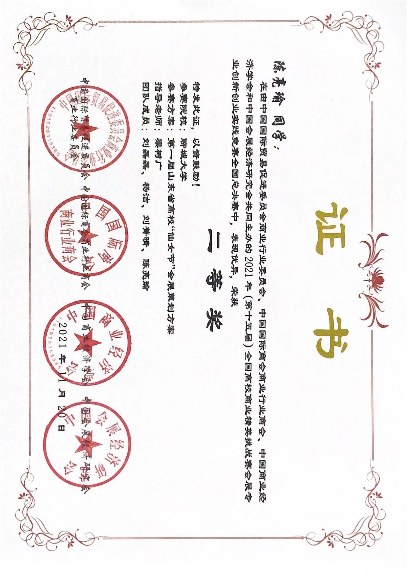 陈亮瑜于2021年11月20日荣获2021年(第十五届)全国高校商业精英挑战赛会展专业创新创业实践竞赛全国总决赛