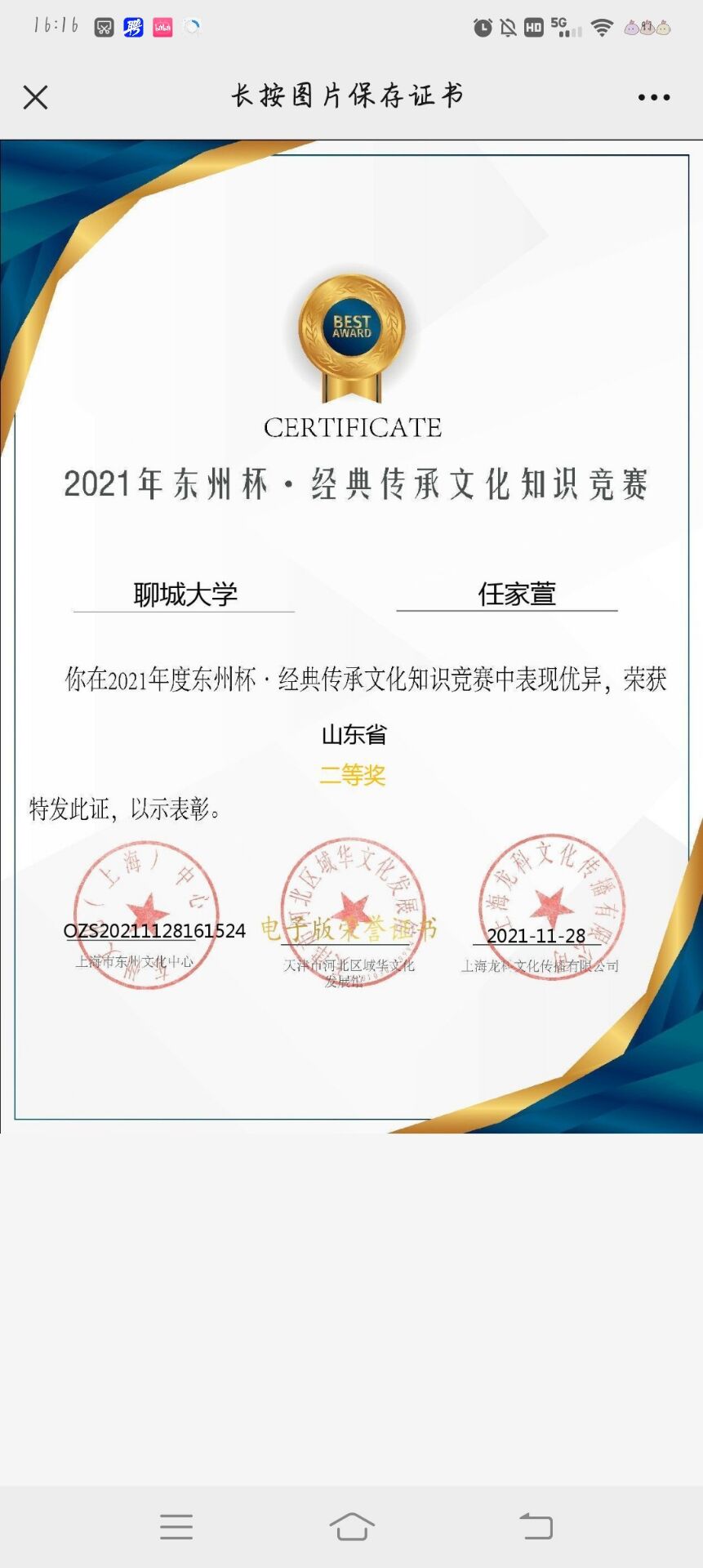 任家萱于3021年11月28日荣获2021年东州杯经典传承文化知识竞赛山东省二等奖