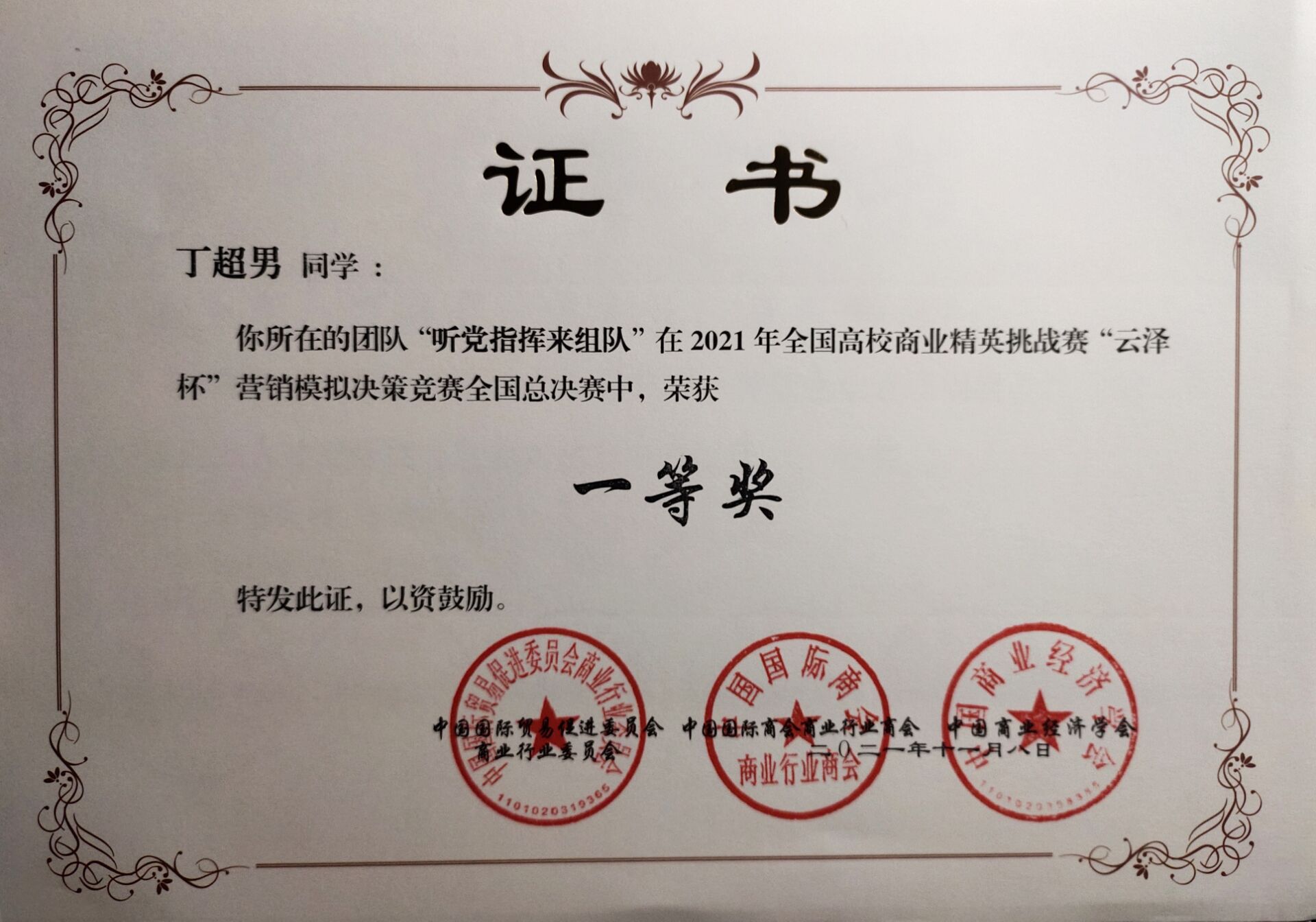 丁超男于2021年11月8日获2021年全国高校商业精英挑战赛“云泽杯”营销模拟决策竞赛全国总决赛一等奖。