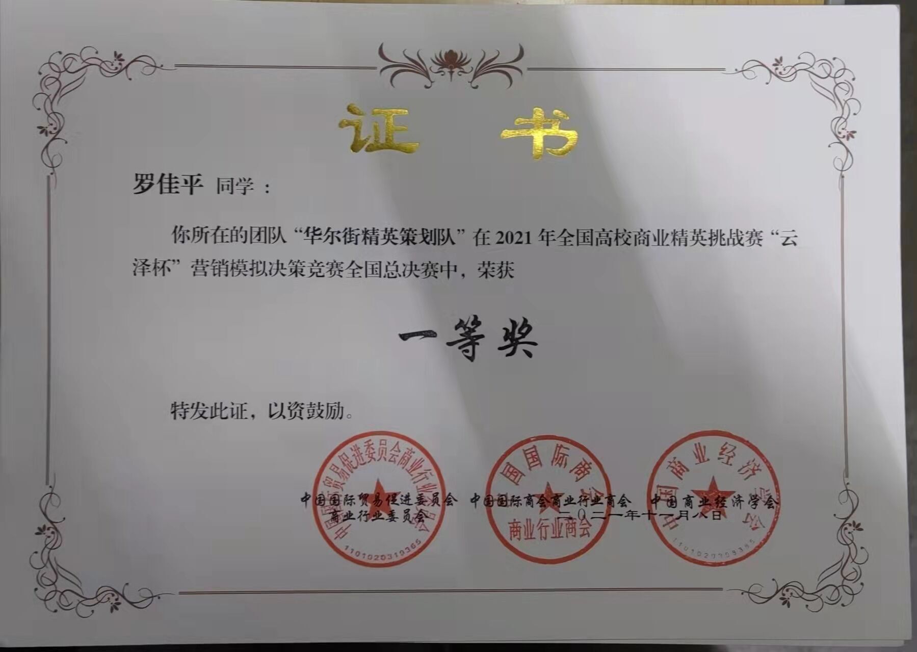 罗佳平于2021年11月8日获2021年全国高校商业精英挑战赛“云泽杯”营销模拟决策竞赛全国总决赛一等奖。