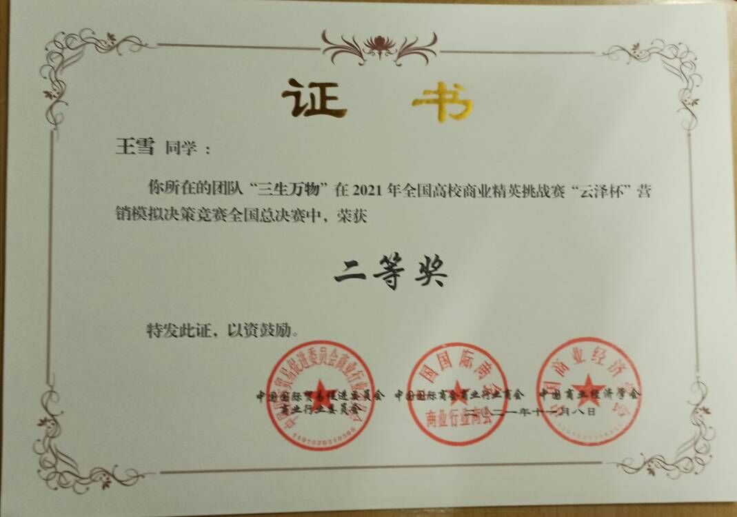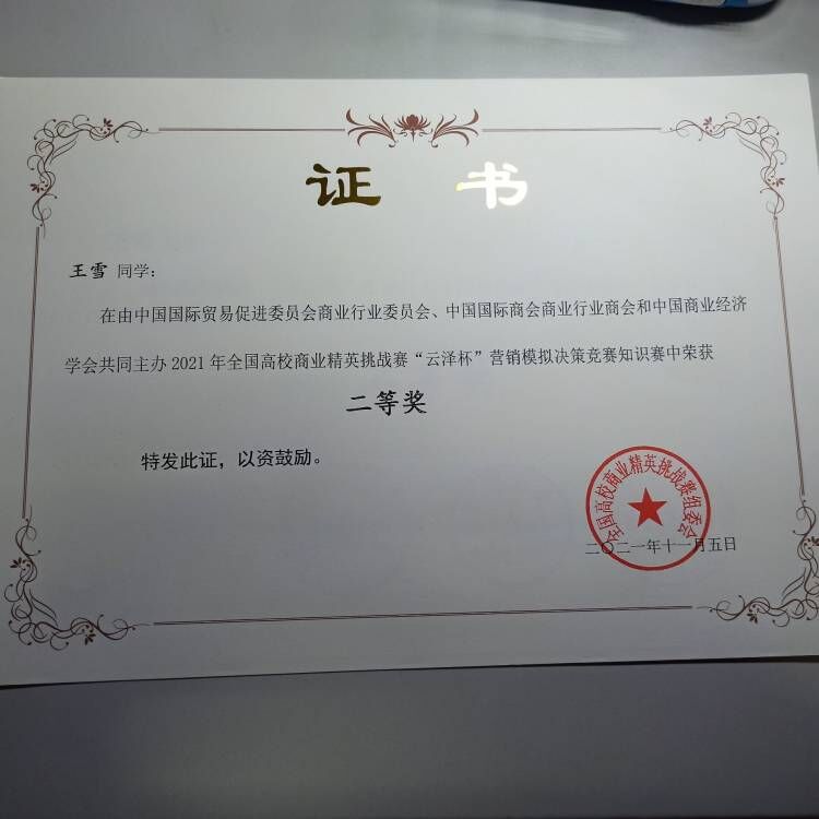 王雪于2021年11月5日获2021年全国高校商业精英挑战赛“云泽杯”营销模拟决策竞赛知识竞赛二等奖。