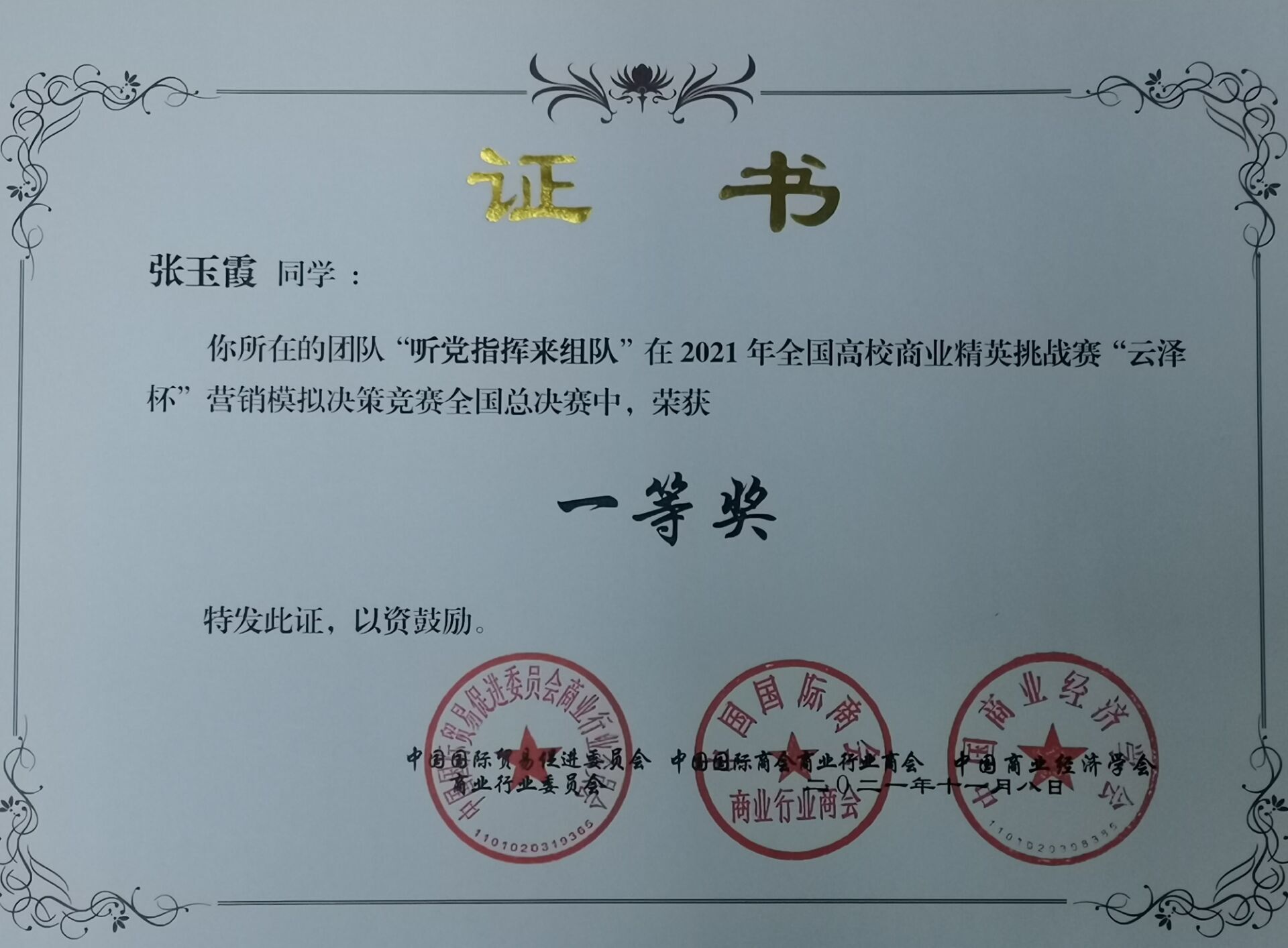 张玉霞于2021年11月8日获2021年全国高校商业精英挑战赛“云泽杯”营销模拟决策竞赛全国总决赛一等奖。