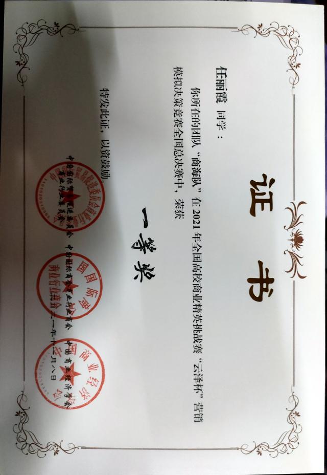 任丽霞于2021年11月8日获2021年全国高校商业精英挑战赛“云泽杯”营销模拟决策竞赛全国总决赛一等奖。