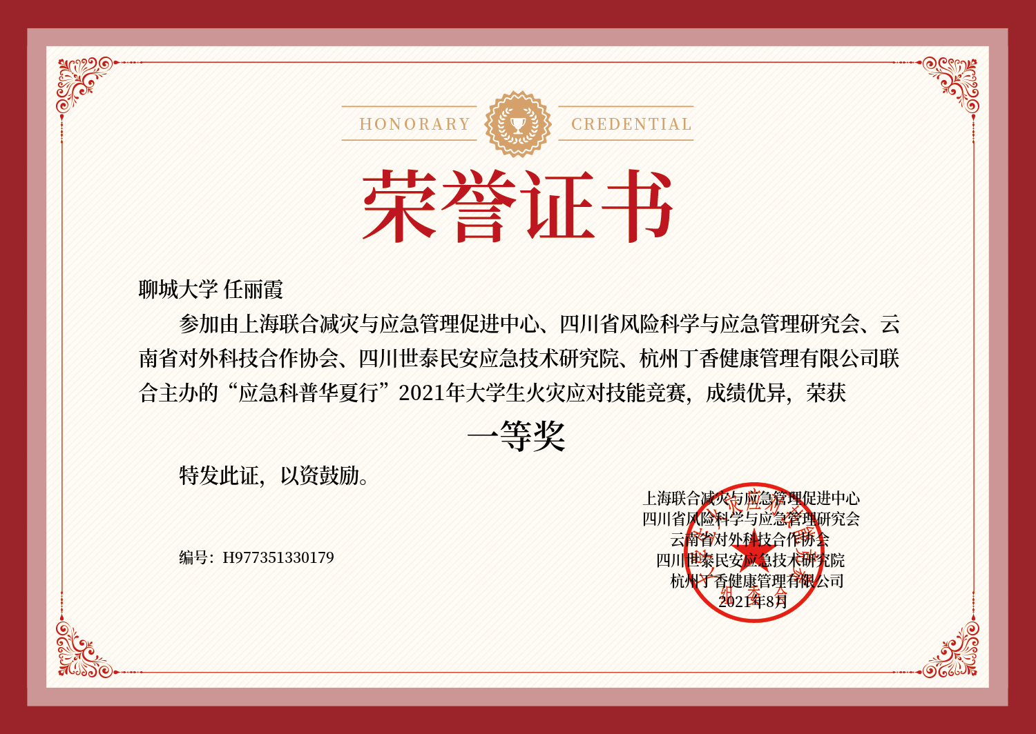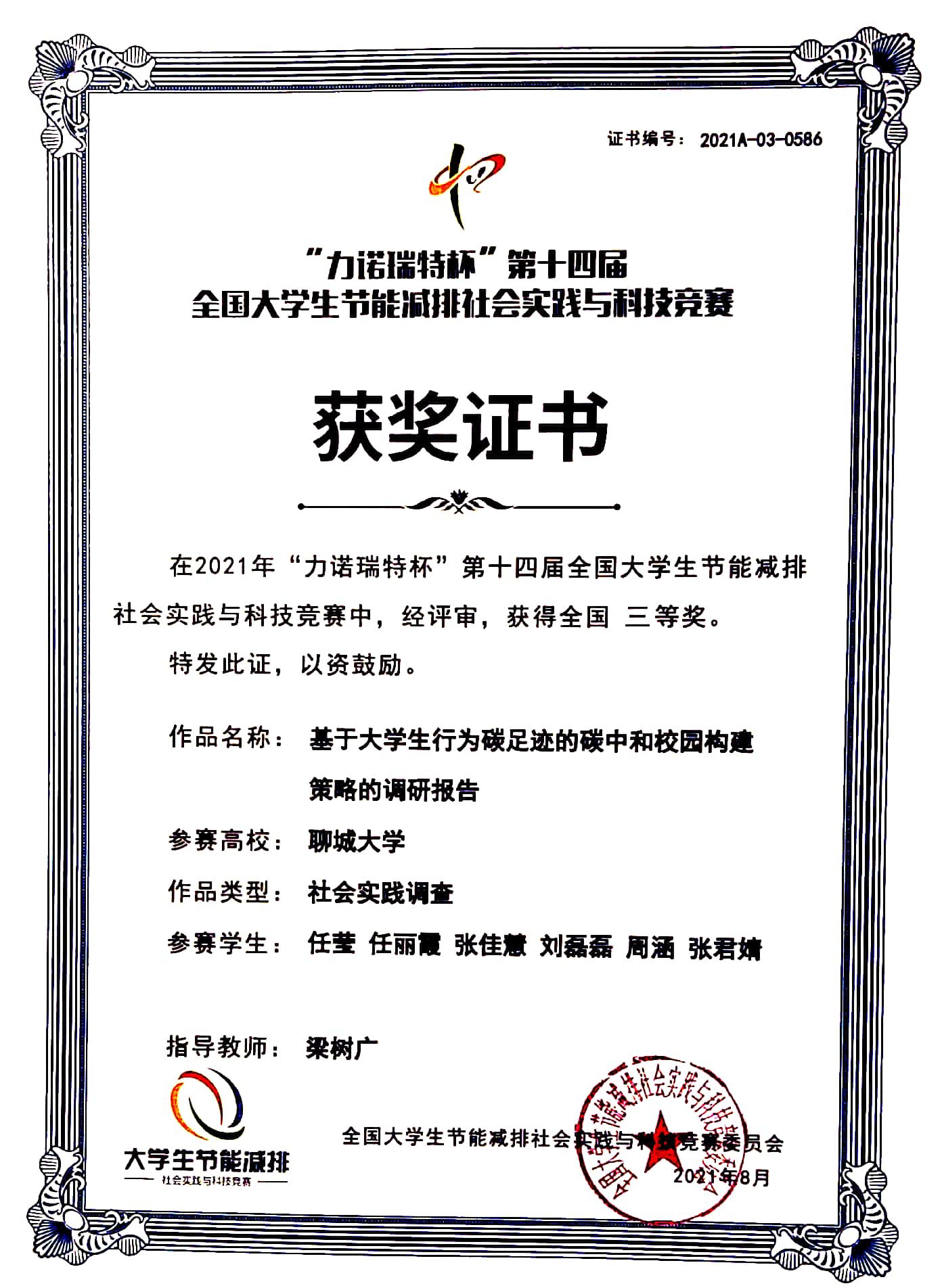 2021年8月,任莹、刘磊磊、周涵、张君婧、张佳慧在2021年“力诺瑞特杯”第十四届全国大学生节能减排社会实践与科技竞赛荣获全国三等奖,任丽霞在2021年“力诺瑞特杯”第十四届全国大学生节能减排社会实践与科技竞赛荣获全国三等奖,同时其在“应急科普华夏行”2021年大学生火灾应对技能竞赛中也获得了一等奖的好成绩。特此,对以上获奖同学予以祝贺表彰。