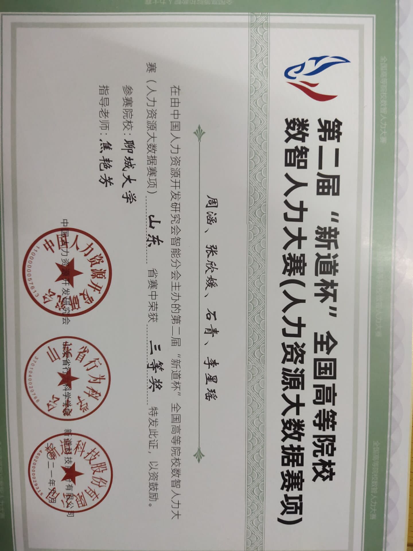 2021年9月,周涵在第二届“新道杯”全国高等院校数智人力大赛(人力资源大数据赛项)中获得山东省赛三等奖,特此,对获奖同学予以祝贺表彰。