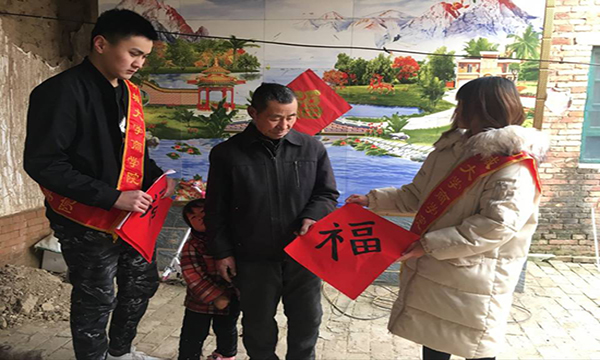 福字是中华传统美德表现形式之一,社会实践队成员亲绘福字来传达人间温暖。活动中,大家饱含热情的书写福字,将辞旧迎新的美好愿景融入到鲜艳的福字中。大家来到热闹的长街,要把新年的祝福传递给更多的人。朱红的纸张,淡淡的墨香和一个个力透纸背的字样吸引了每个人的注意。社会实践队成员将福字赠送给附近的居民,并向大家表达新年的祝福,居民和成员激动的说着过去一年的收获以及新一年的打算计划。“除夕畅饮千杯酒,新年更上一层楼”,一幅幅寓意吉祥的福字送至居民的手中,同时也把人间的温情祝福送到了居民的心里。