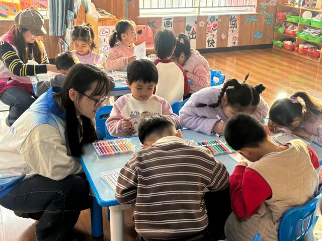 志愿者巧妙运用静态职业图片展示与趣味动画播放相结合的方式,在职业小知识科普环节用通俗易懂的语言讲解职业常识,以引导式提问助力孩子们深入思考职业的社会价值。在随后的绘画创作环节中,志愿者积极引导孩子们在职业轮廓填色卡上精心涂色,用五彩斑斓的色彩描绘出自己心中对职业的独特想象,并通过创作过程中的互动帮助孩子们强化对职业特征的记忆。