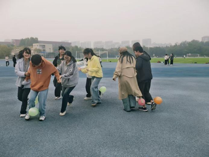 “挤爆气球”和“踩气球”游戏将活动氛围推向高潮。“挤爆气球”需要两人一组,精准把控力度与配合节奏,在一次次协作尝试中展现出对团队默契;“踩气球”游戏里,各小组攻防兼备,在奔跑与策略制定中深刻体会团队协作的重要性,大家全身心的投入游戏,每张笑脸上都洋溢着热情与活力。这些游戏是“人力资源服务微专业”实践教学的生动载体,把团队管理、协作沟通等专业知识巧妙地融入趣味互动,让同学们在沉浸式体验中深化对管理理论的认知,助力大家将理论知识转化为实际能力。