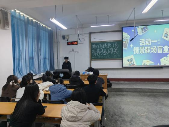 由潘天佑同学牵头组织策划,以“抽盲盒解职场难题——实战解锁应对技巧”为主题。活动伊始,各参赛小组依次上台抽取情景盲盒,“临时接手同事未完成的紧急项目”“向强势领导提反对意见”“化解跨部门协作矛盾”等贴近职场真实场景的任务,瞬间点燃现场氛围。拿到任务卡后,同学们迅速进入状态,围绕核心问题展开激烈讨论,分工设计剧情、打磨台词、模拟互动场景,15分钟的准备时间里,各组都展现出极强的团队协作能力。