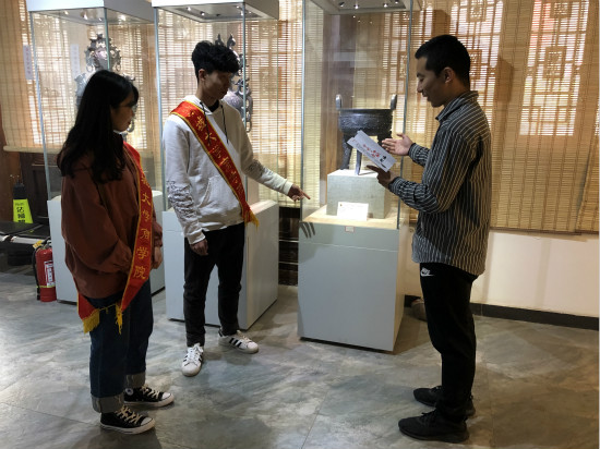 “黑如漆、薄如纸,硬如镜、硬如瓷、声如磬”是黑陶器皿的独特之处。活动初始,负责人邀请了对黑陶文化有一定了解并在此方面有兴趣的聊城本地同学作为向导在参观过程中时时为队员们讲解。通过参观学习了解到:“曾在本博物馆出展的茌平黑陶艺术经典作品“九龙薰”被山东省委、省政府作为香港回归礼物赠与香港特别行政区。”活动期间,队员们自愿充当起志愿导向员的角色,为前来参观的游客和市民、小朋友们讲解黑陶文化。并且在负责人的提议下模仿了央视节目《国家宝藏》节目,得到了小朋友的喜爱和参观者的一致好评。活动最后博物馆负责人向我们介绍说,二楼将展出茌平特色剪纸作品,整个博物馆展现红与黑的特色艺术。未来,还将聘请黑陶和剪纸方面的专家到博物馆内现场展演,让游客在参观游览之余,参与到作品的制作过程之中,体验独特黑陶和剪纸技艺的艺术魅力。