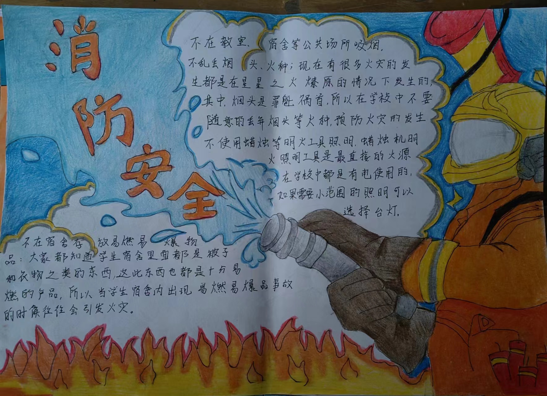 活动前期,相关负责人对活动大力宣传,鼓励同学们积极报名,提高校园消防安全意识,承担维护校园消防安全的责任。该活动也得到了同学们的积极响应。活动过程中,参与人员及时上传作品,紧紧围绕“消防在我心,安全伴我行”的活动主题,在手抄报中融入了自己的思考和理解,切实抒发了自己对消防安全的看法,普及了消防安全知识,同时认识到应自觉承担起维护校园安全的责任,从自身做起,减少和避免校园火灾的发生。活动后期,评委们根据手抄报的内容、创意、美观程度等多方面进行公平、公正地评选出了一、二、三等奖,并给予了相应的奖励。最后,组织者们呼吁同学们应积极主动地学习消防安全知识,不断提高自身的安全意识和应对突发事件的能力。