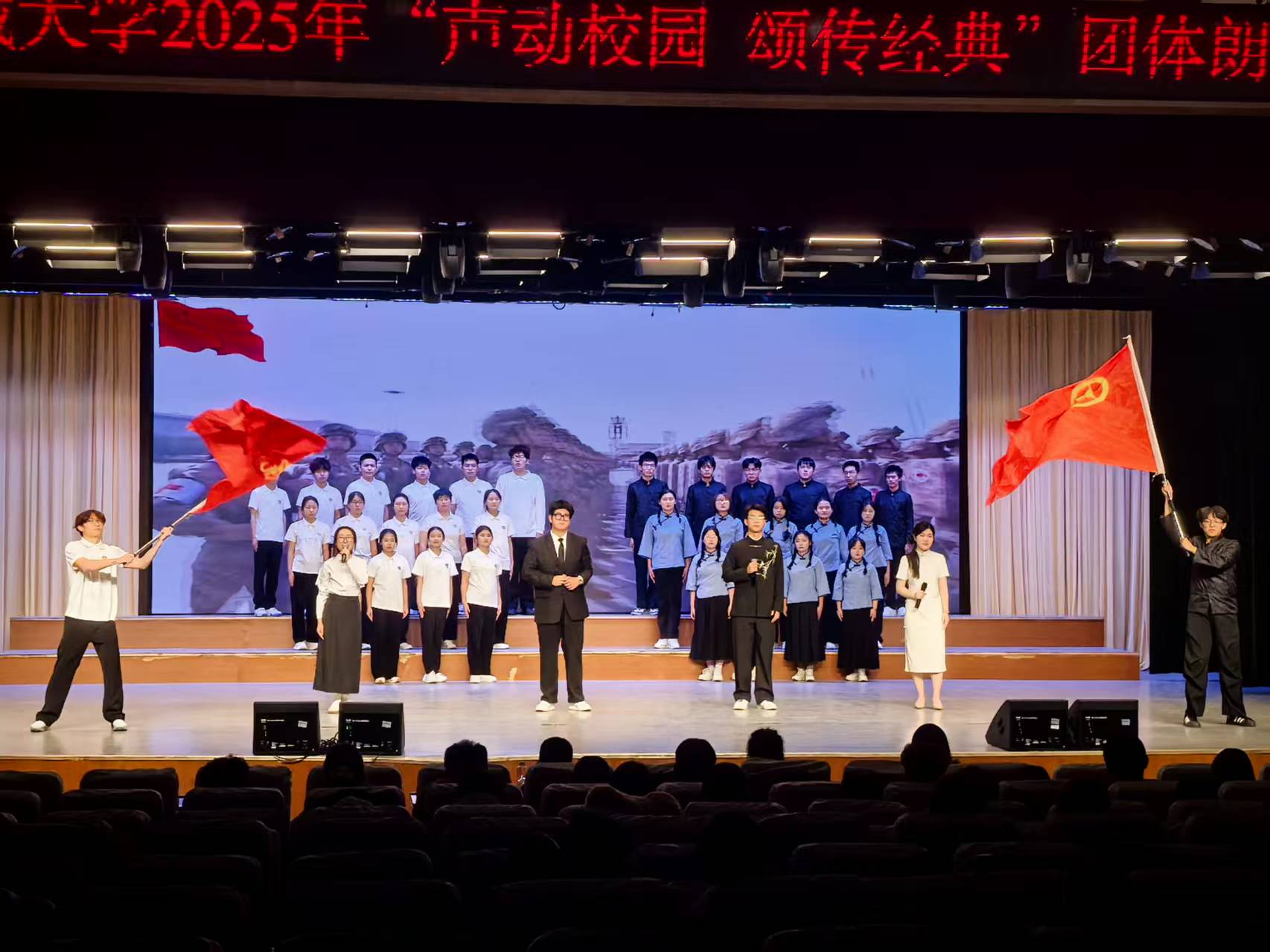 初赛现场,我院学子竞相绽放风采,36名学子凭借扎实的朗诵功底与极具感染力的舞台表现,在初赛中脱颖而出顺利晋级校级决赛,并以经典篇章为载体,通过的团队协作与富有创意的舞台呈现,将经典故事中蕴含的革命精神演绎得生动传神、直抵人心,深刻歌颂了革命先辈不屈奋斗精神的同时,也展现了新时代青年的使命担当和商院学子奋发有为、锐意进取的精神风貌。最终,经评委打分,我院团支部成功斩获校级决赛二等奖。