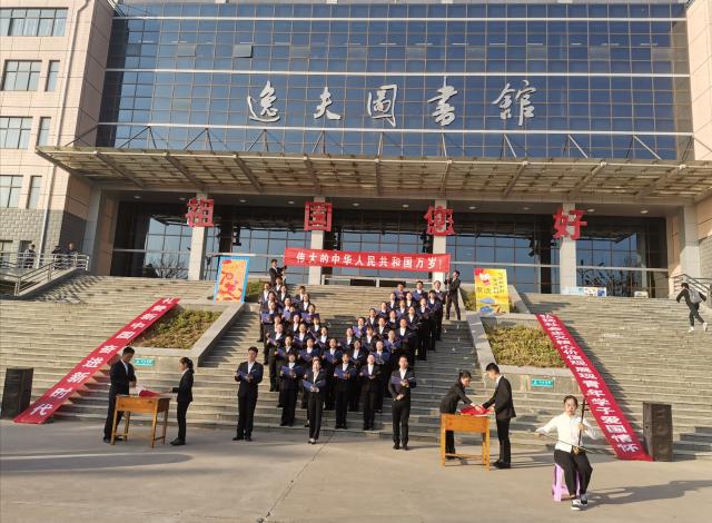 商学院朗诵队每位同学用最真挚的感情,最有力的话语,表达出对祖国最崇高的热爱,他们以最高昂的激情与信心在东校区在逸夫图书馆前进行了展示。表现出热情的聊大学子一心向上积极态度。