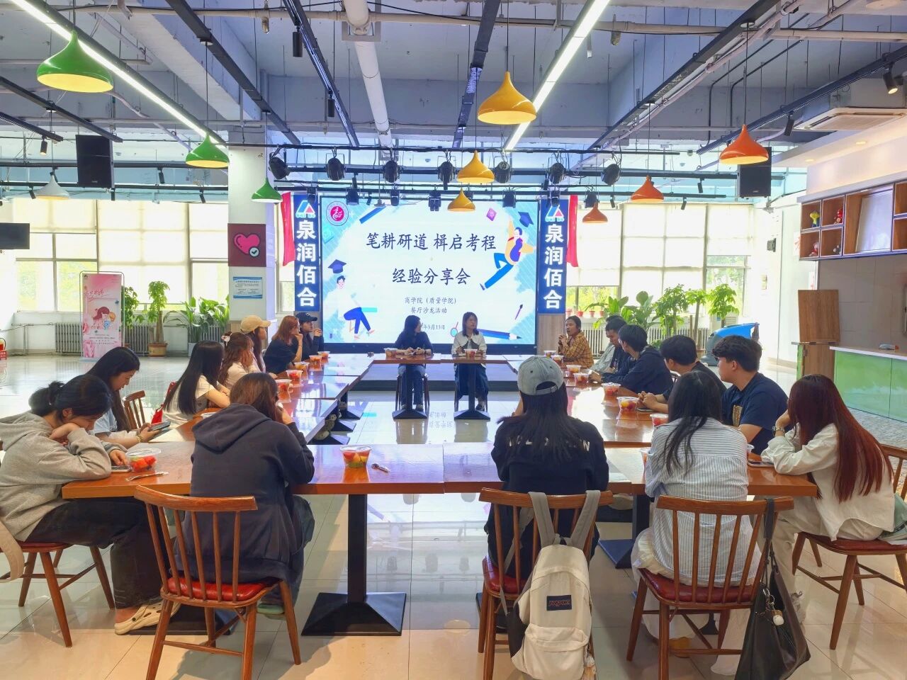 5月13日,商学院(质量学院)于东校区翰苑餐厅二楼举办“笔耕研道楫启考程”主题餐厅沙龙活动,2021级1班王涵,2021级6班田心雨、李鑫宇,2021级7班王向群受邀担任主讲人,分享个人学习、备考经验,活动由学院辅导员巨梦薇、刘聪睿主持。