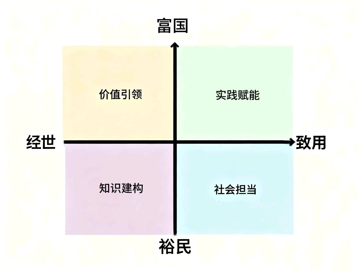 “四象限·1234N”“家国价值”(富国-裕民)为纵轴,以“商学能力”(经世—致用)为横轴,构建“价值引领—知识建构—实践赋能—社会担当”的立体化坐标系