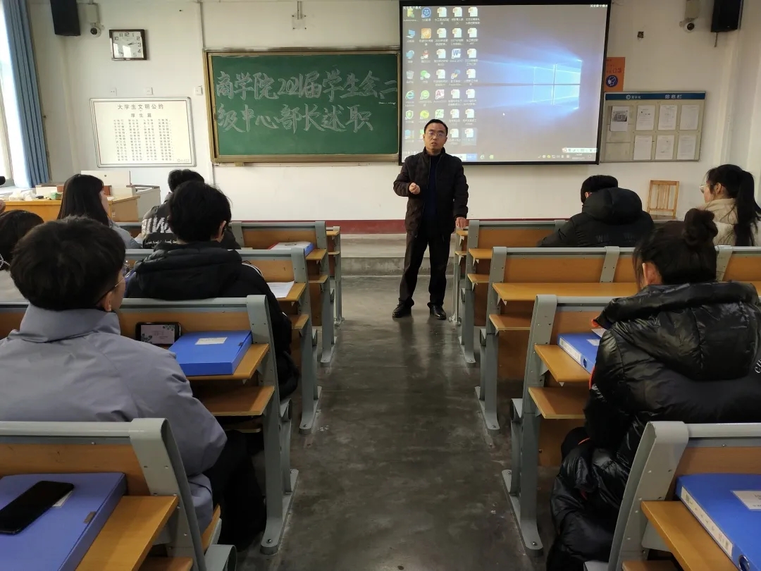 学生会是在党委领导下的主要学生组织,以全心全意为同学们服务为宗旨,是学院联系广大学生的桥梁和纽带。为了解本学期学生会各部门工作情况,加强部门建设,12月17日,商学院于东校区1#305举办2021届学生会、二级中心部长述职大会。商学院团委书记岳增刚出席了本次活动。