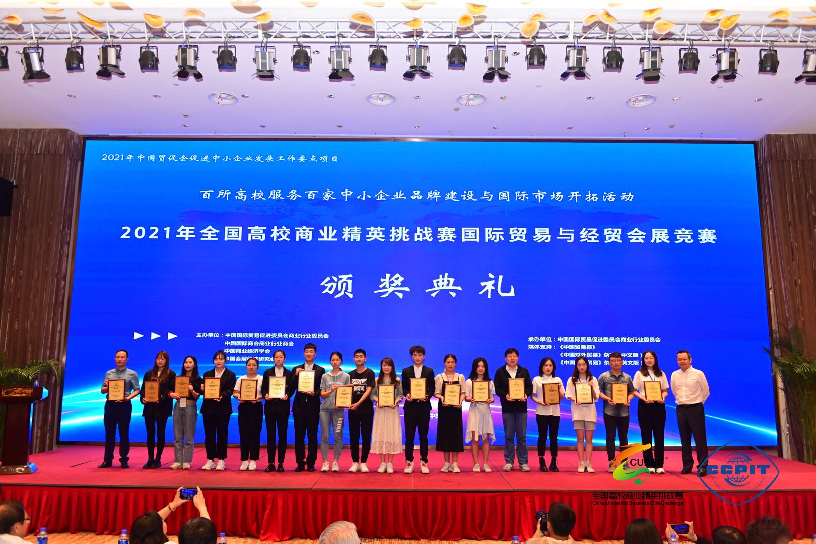 全国高校商业精英挑战赛是目前我国国际经贸教育领域最大的现场赛事和创新实践活动,参赛团队以企业名义参赛,为企业提供品牌营销策划和海外推广方案,包括参展计划书、展位海报设计、商品陈列、新品发布会和全英文商贸配对贸易谈判等多个环节,要求成员运用熟练的口语、丰富的专业知识,相互合作,在外贸运输方式选择、贸易术语转换、出口操作单证以及贸易合同等方面与“采购商”模拟谈判,顺利达成交易。本次大赛共有来自北京、福建、湖南、黑龙江等21个省、自治区和直辖市包括湖南大学、安徽大学等的116所高等院校209支参赛队伍,奖项以30%、40%、30%的比例设置一等奖、二等奖、三等奖。