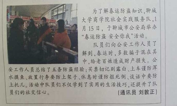 年关将近,春运拉开序幕,然而全国人民皆大欢喜的同时春运防盗不可大意。为了解春运防盗知识,英国365公司商学院社会实践服务队,1月15日,于聊城市公安局举办“春运防盗安全你我”活动。队员们向公安工作人员了解到,春运时,多数骗子混在其中,给老百姓造成财产损失。公安工作人员总结了五条防盗经验:买票切记别露白、上车谨防浑水摸鱼、放置行李要防上架子、休息时谨防抠死倒、谈话中要防上托儿。活动中队员们学习到了实用的生活技巧,有助于队员们社交信心的提升。(通讯员刘敦正)