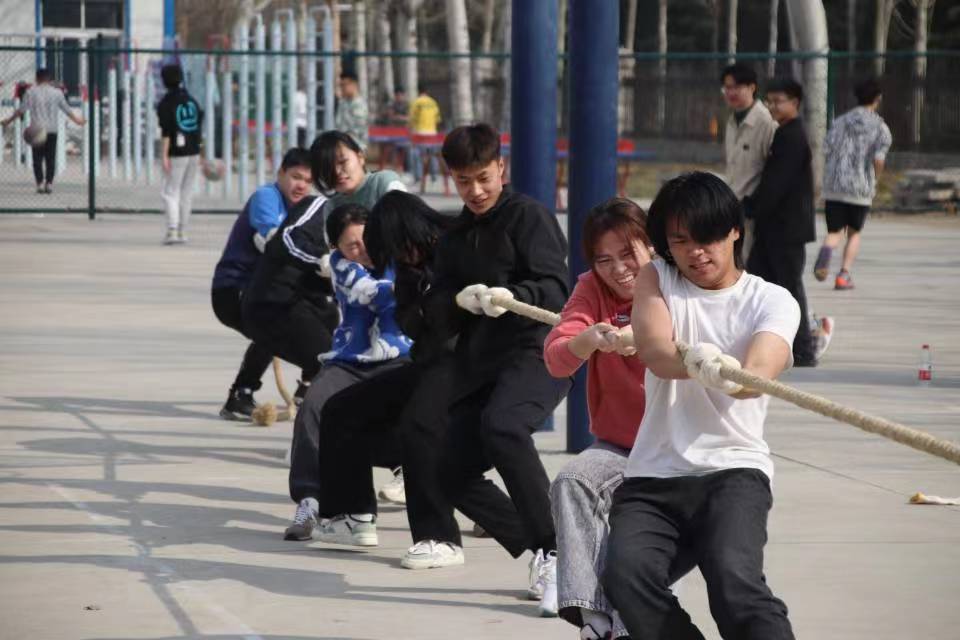 三月的风温暖和煦,万里晴空下的赛场一片喧哗热闹。参赛选手摩拳擦掌,精神振奋,戴上手套,换上运动鞋,做好赛前准备。大家热情高涨,一场精彩纷呈的赛事即将打响。活动伊始,各班级通过随机抽签的方式分成小组进行两两对决。随着首场比赛的第一哨吹响,一声令下,拔河比赛展开了激烈的对决。每个队员都鼓足了劲,涨红了脸,抓紧绳子,全力以赴,努力争夺。裁判员和工作人员们恪尽职守,热情服务。未参赛的同学们自发组成啦啦队为比赛队员呐喊加油,给比赛增添了一抹亮色。无论是一鼓作气的瞬间秒杀,还是实力相当的劲敌较量,都牵动了在场人们的心,大家纷纷在旁加油助威,哨声、呐喊声、鼓掌声、欢笑声此起彼伏。各队伍胜不骄,败不馁,发扬了团队协作,顽强拼搏的精神。经过激烈的角逐,最终22级10班获得一等奖,22级14班和15班分别获得二等奖和三等奖。