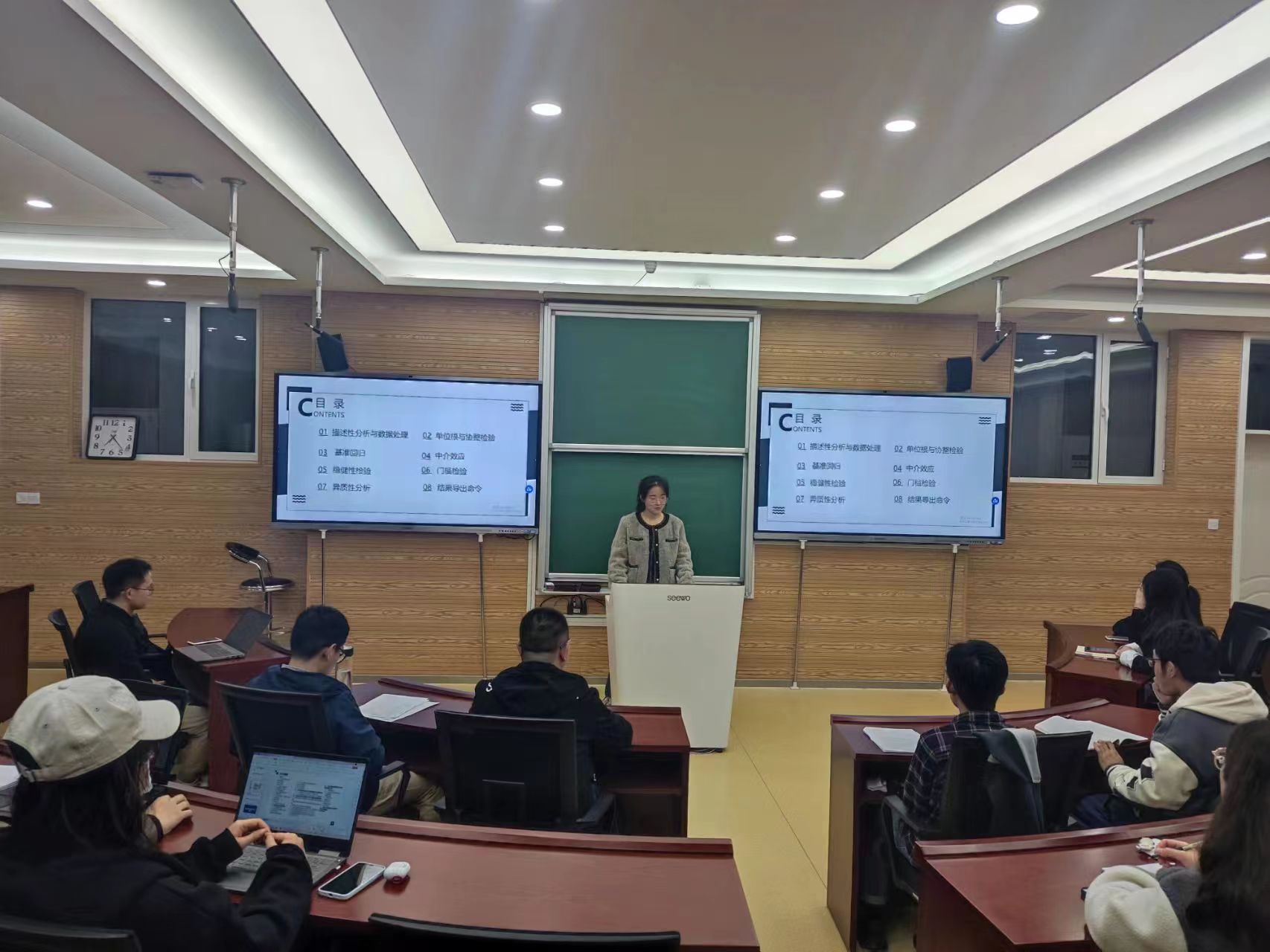 在交流会上半场,如火如荼。主讲人刘津澔对SPSSAU分析工具及如何运用SPSS AU实现熵权TOPSIS展开汇报并进行了演示。紧接着,主讲人张文康围绕着空间计量模型,向全体同学介绍了空间计量模型的概述、空间自相关检验与案例操作等。主讲人宋丽丽为大家讲解工具变量的使用及其注意事项。主讲人孟迪以文章《中国农业绿色发展水平测度及其时空特征分析》入手,带领大家从研究背景、研究方法、结果分析及对策建议研读文章。主讲人刘宏宇围绕着实证论文写作的一般过程,从数据获取与处理、基本实证命令及检验、结果导出三个方面出发,向全体同学介绍了实证论文写作的基本过程及操作等。随后,主讲人臧文嘉承接实证论文写作的实证过程,具体详细地向同学们展示了结构方程模型的基础知识及其操作。上半场,在一片激烈的讨论中度过,同学们津津有味,期待下半场的学术盛宴。