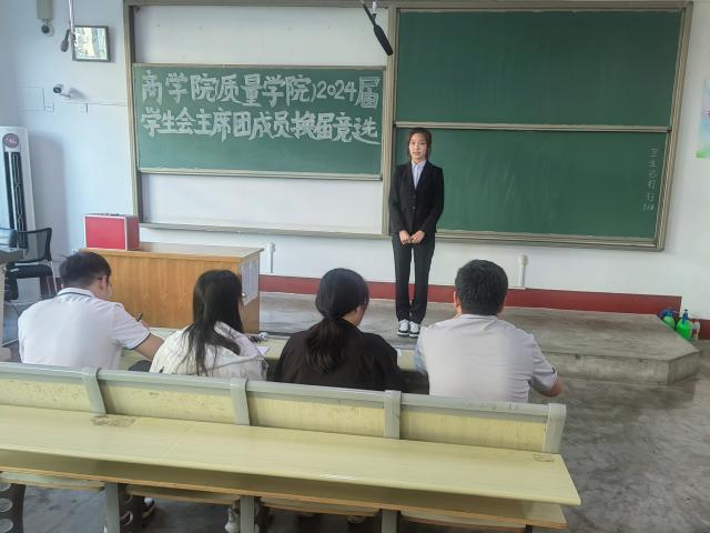 为进一步增强学生会的活力,保障学生会工作的连续性,发挥学生会自主管理、自我教育的作用,9月21日,商学院(质量学院)于东校区1#301举办商学院(质量学院)2024届学生会主席团成员换届竞选大会。商学院(质量学院)团委书记刘玉华、辅导员焦艳芳、张琼、巨梦薇、高鹏、施安琪以及2023届主席团成员、2022级学生代表参与此次活动。