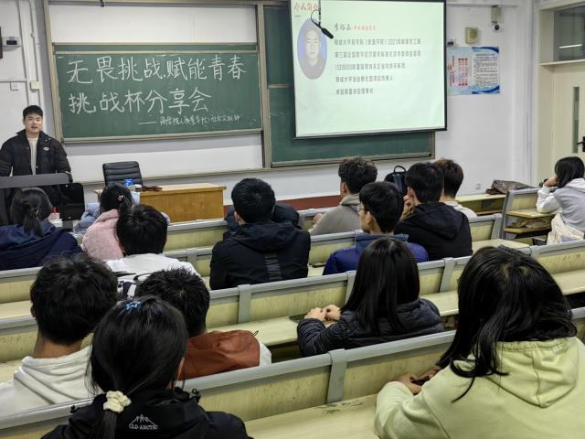 分享会伊始,李裕函以PPT的形式介绍了他的参赛经历和所获奖项,细致地从“赛事流程”、“赛事备赛”、“作品打磨”三个角度讲述了自己一路走来的历程,并介绍了“挑战杯”的备赛技巧和自身的比赛感悟。他希望同学们利用课余时间踊跃参与科创比赛,挖掘自己的创新思维。接着,张婧从挑战杯的赛事赛程出发,向同学们细致地讲解了如何确定选题、申报、推进项目运行,并介绍了比赛中的实用答辩技巧。活动结束后,主讲人们耐心地解答了一系列问题,使同学们日后备赛的思路得到了进一步的拓展和启发。