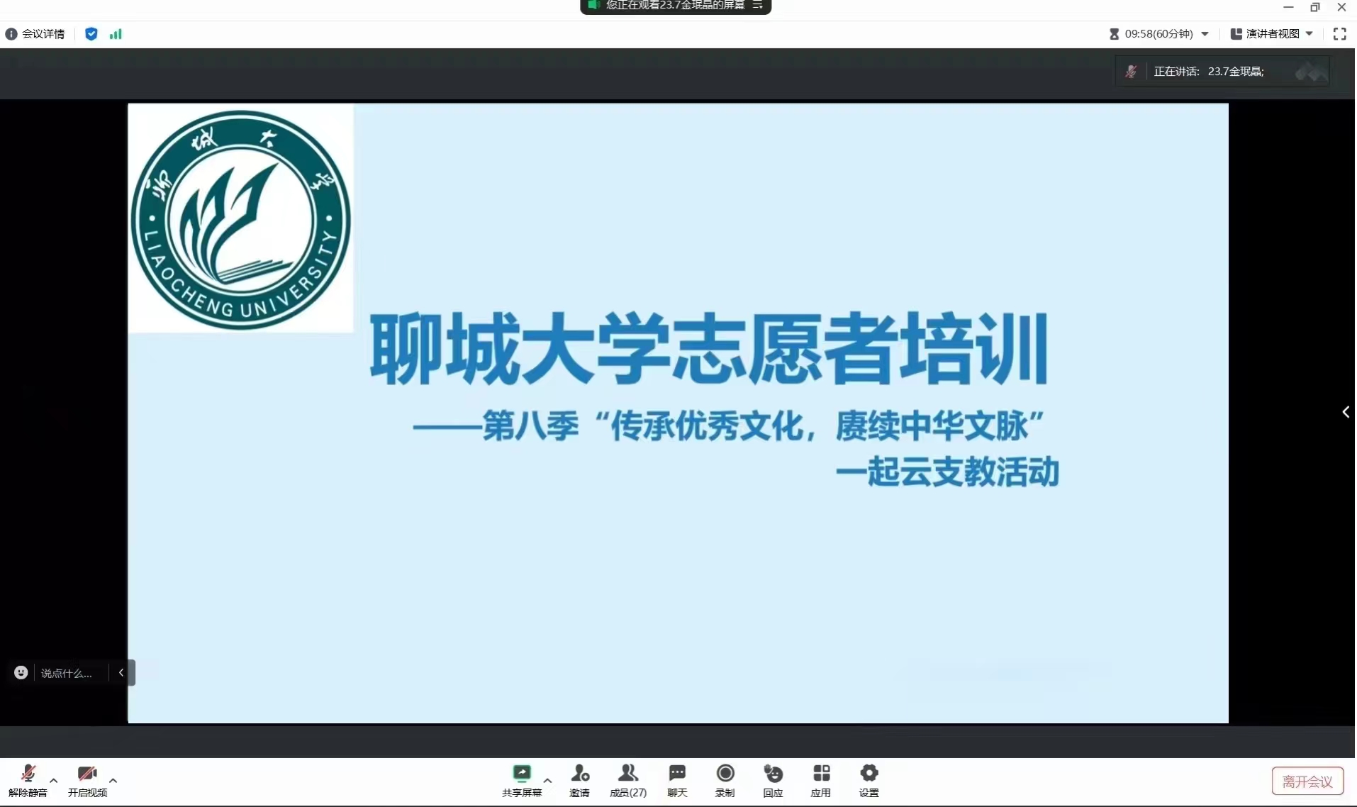 本次“一起云支教”专项实践培训会议的顺利召开,让志愿者进一步了解了“云支教”的基本流程与活动内容,有利于激发志愿者完成云支教活动的热情与决心,将自身所学更好地投入志愿服务中,增强学生参与社会实践的参与感、获得感、幸福感,在传承优秀文化,赓续中华文脉中积蓄青春力量,彰显青年担当。