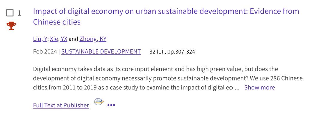 根据ESI最新公布的数据显示,我院经济系教师刘洋以第一作者在《Sustainable Development》发表的题为“Impact of digital economy on urban sustainable development: Evidence from Chinese cities”的SSCI期刊论文,入选ESI高被引论文,进入全球前1%论文之列。