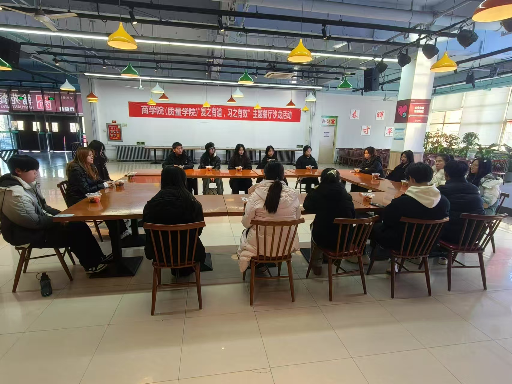 12月26日,商学院(质量学院)于东校区翰苑餐厅二楼开展“复之有道 习之有效”期末备考主题餐厅沙龙活动,邀请2023级优秀学生代表甄佳慧、肖玉雪分享备考经验,学院辅导员韩亭亭、刘聪睿及2024级各班班团参加活动。