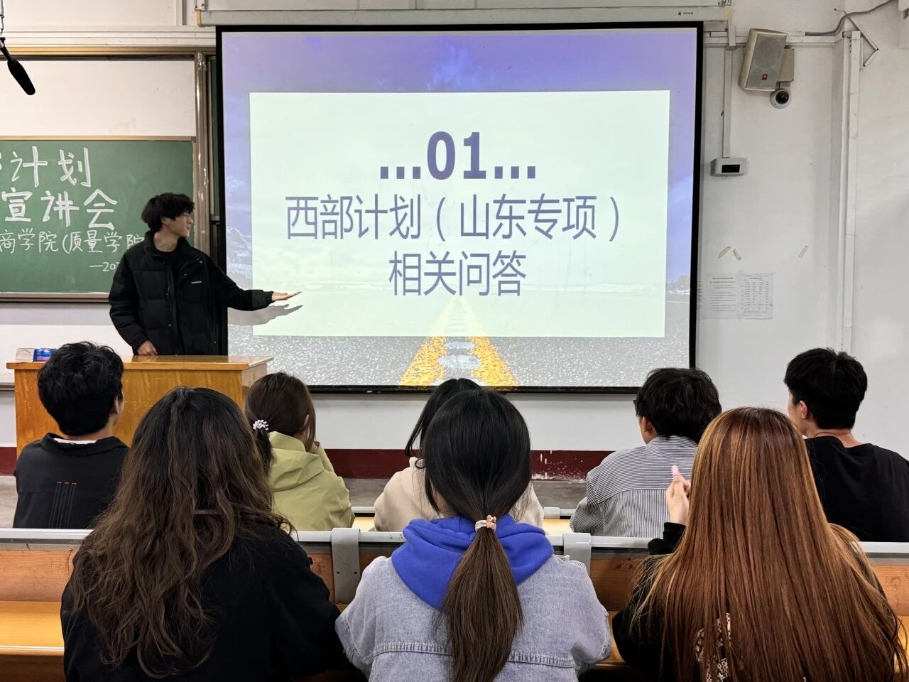 此次宣讲会以线上线下融合的方式有序开展,活动负责人刘晓畅首先带领同学们观看了英国365公司西部计划工作纪实视频和招募宣传片,从服务内容、优惠政策到发展前景全方位解读西部计划,有效激发了同学们的参与热情。孙意祥、侯旭涵借助线上直播平台,深入阐述了西部计划的“聊大现象”,并针对专项补贴、生活补助、休假制度等保障措施进行了细致解读。
