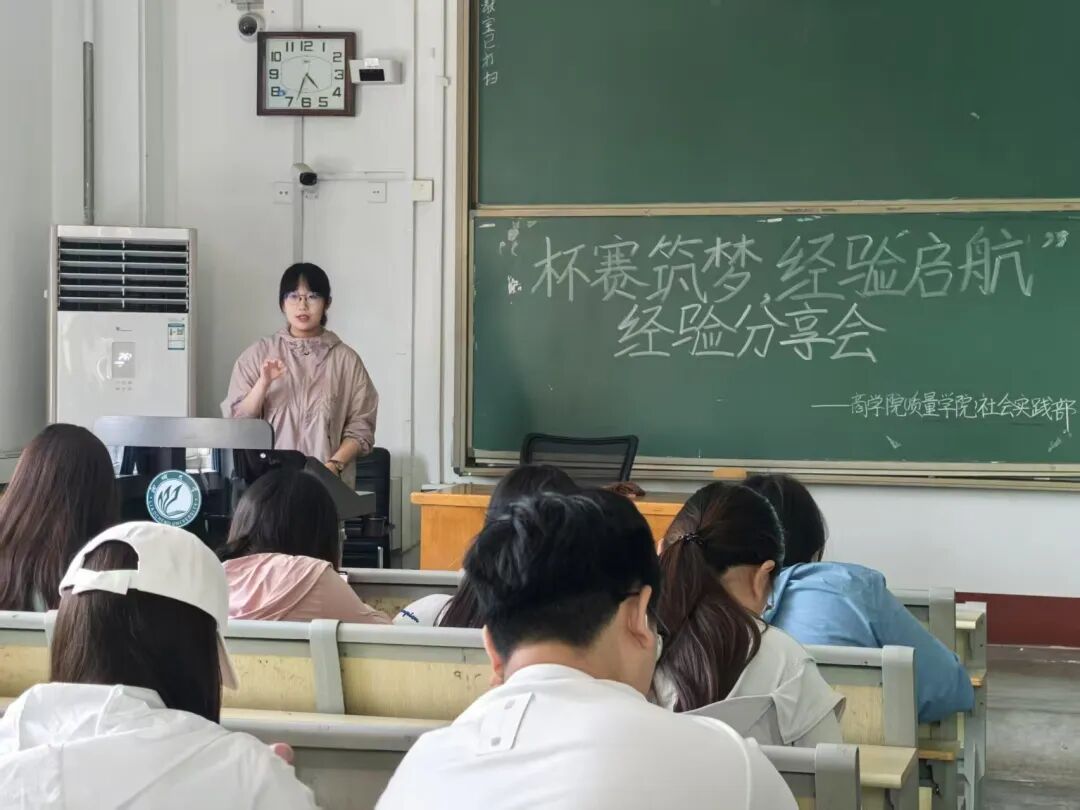 为共同汲取竞赛经验,激发同学们的创新热情,5月18日,商学院(质量学院)于东校区1#302举办“杯赛逐梦 经验启航”挑战杯经验分享会,2022级2班夏宁受邀担任主讲嘉宾,2023、2024级共53名学生参会。