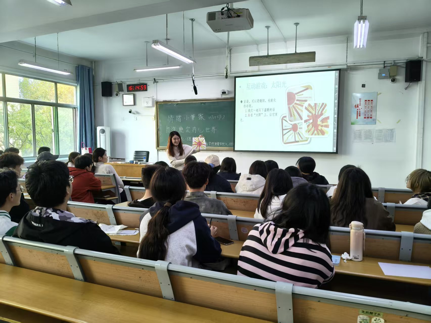 本次大讲堂邀请了赵巍平学姐,结合大学生常见的心理困惑,用生动案例+实用技巧的方式,分享情绪管理、压力调节、人际沟通的小妙招。同学们在赵学姐的带领下进行了小游戏:情绪猜猜猜,让大家更好地理解了情绪的表达。同时还学习了缓解压力的方式,让大家更好地与情绪相处。最后,大家一起写下温暖的话做成太阳,让言语变成激励人心的暖阳。