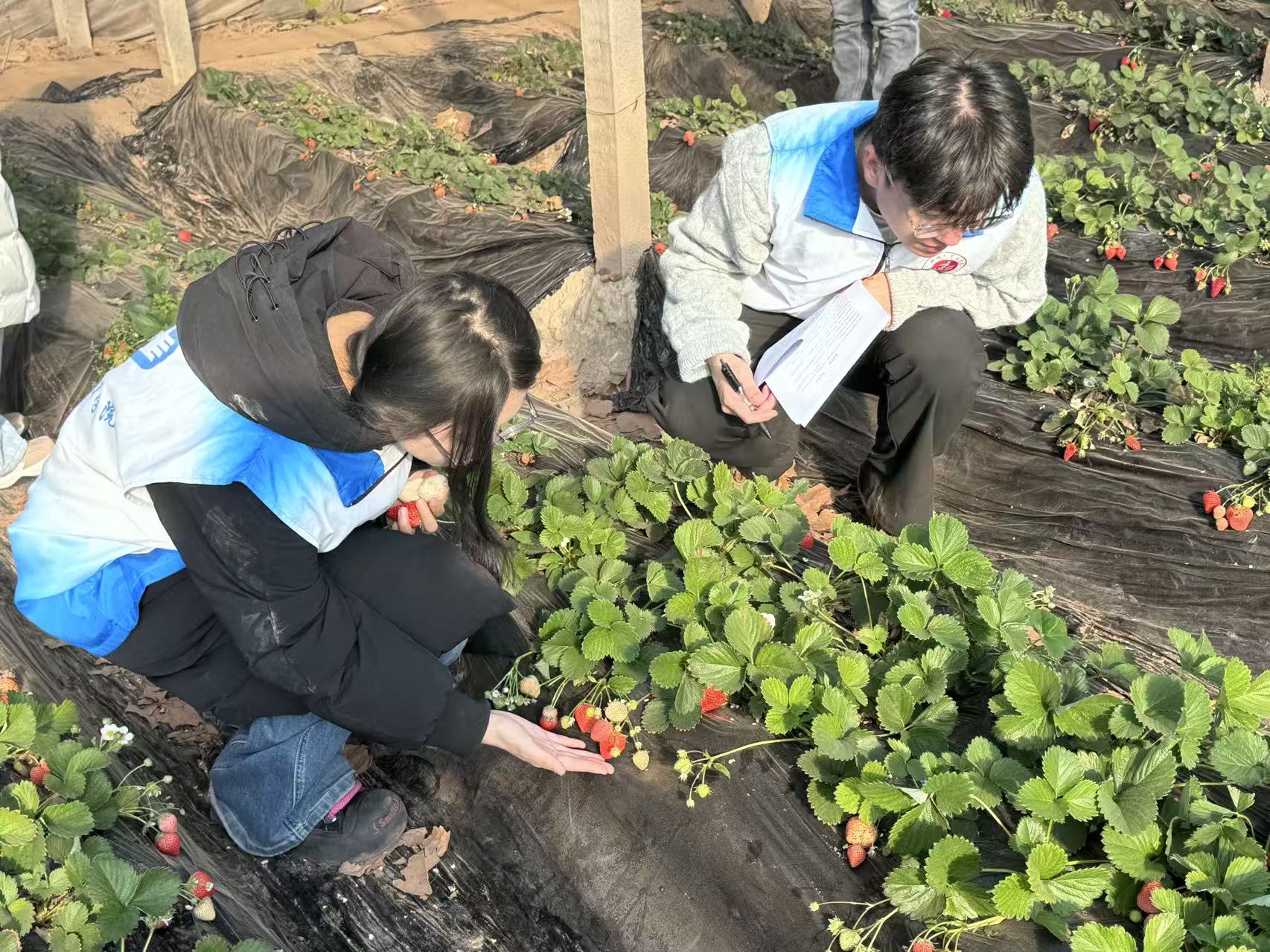 团队成员近距离观察草莓