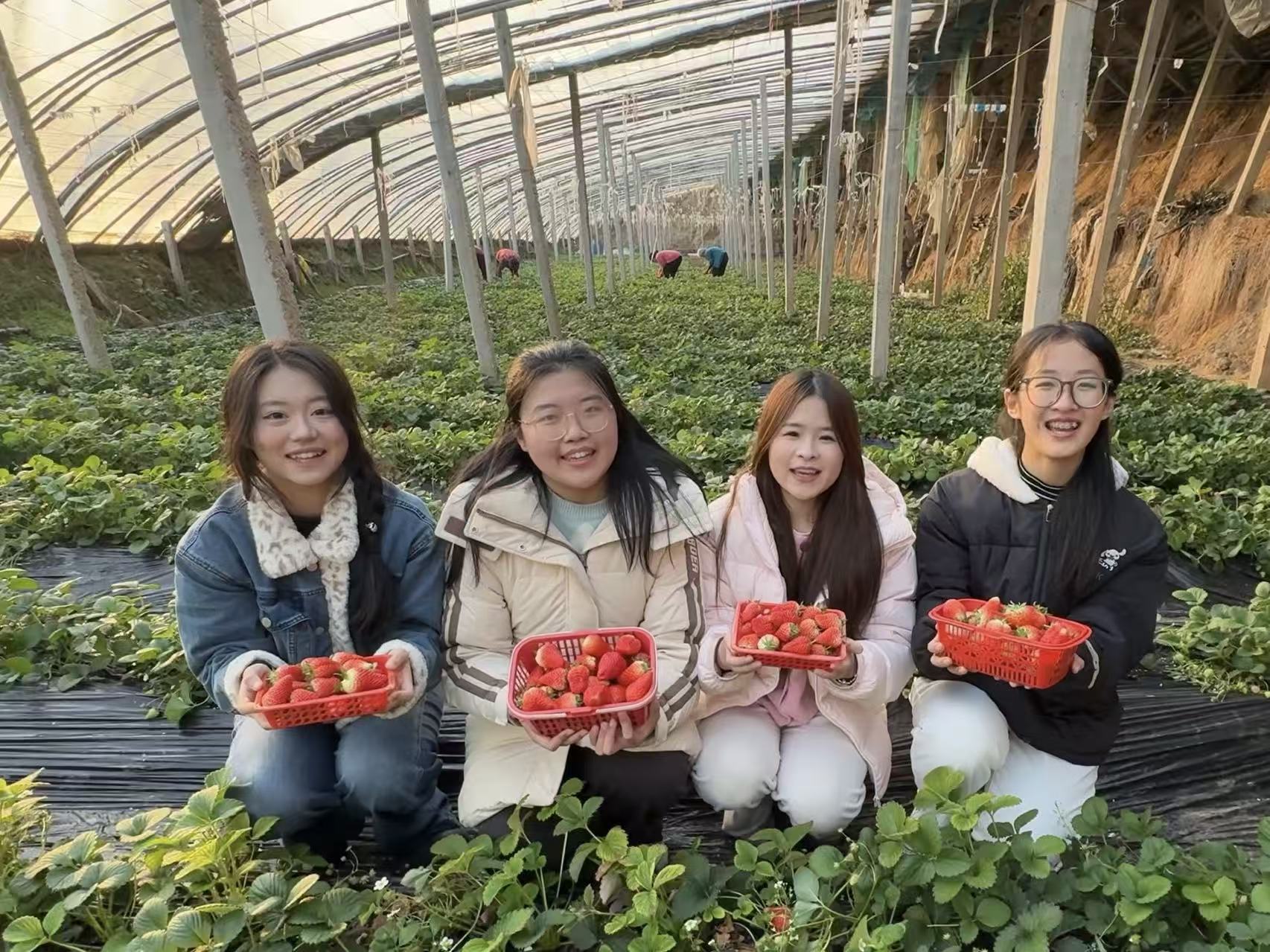 团队成员结合农场负责人的讲解,系统梳理农场发展脉络,了解其绿色生态种植技术、运营模式和发展愿景,并走进大棚实地观察记录草莓生长状态及产品核心优势。通过校企地三方深度探讨,实践团队精准定位产业引流范围局限本地、品牌包装无特色、线下体验场景单一等推广痛点,并结合专业知识明确新媒体引流、特色包装设计、多元渠道拓展等赋能方向,为后续实践打下坚实基础。