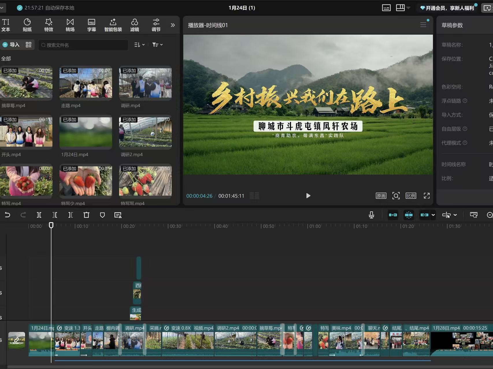在此基础上,实践团队反复调整拍摄角度与光线,用镜头定格草莓生长、采摘瞬间及标准化种植细节等画面,累计拍摄素材超300分钟,全面收录草莓的生长之美与产业之兴。通过对拍摄素材进行系统性筛选、粗剪与精修,搭配背景音乐、字幕特效并调试画面色调等剪辑流程,经内部研讨评审和指导团队把关,最终打磨完成15条优质系列宣传视频,有效构建起兼具网感与质感的立体传播内容矩阵,为斗虎屯草莓打造了专属传播名片。